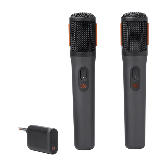 Make your good times even better with JBL PartyBox Wireless Mics. Just plug them into any JBL PartyBox, or use the dongle for the freedom of a wireless connection, and let your voice be heard. Indoors or outside, you'll sound clear and captivating on these mics specially tailored to sound amazing over any PartyBox speaker. A built-in foam pop filter minimizes any extraneous vocal sounds as you sing a duet with your best friend, and a shock mount system keeps things quiet when you're passing the mic to someone else. Up to 20 hours of play time and because you can still use a mic even while it's charging on the PartyBox's built-in power bank, the fun will last as long as the party does. Rock the house with the JBL PartyBox Wireless Mic.